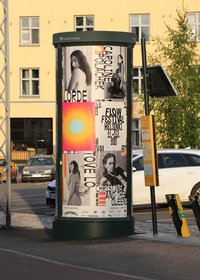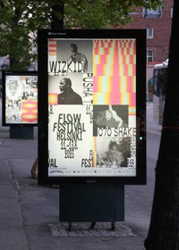 Visual identity for the 2023 edition of Flow Festival Helsinki. The elements started to narrow and stretch and the identity system was developed further. The use of white space became a central element.